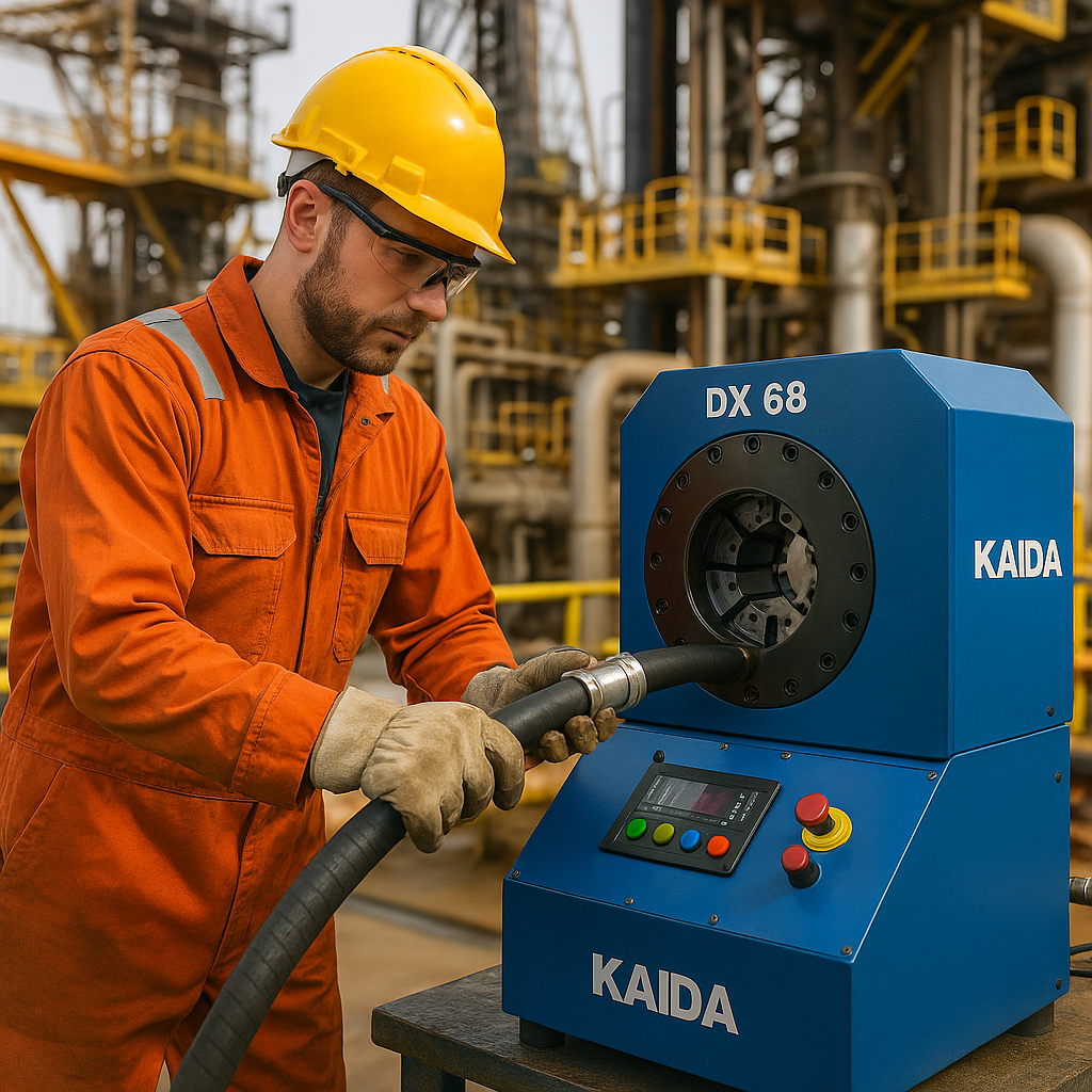 An oil and gas engineer secures a high-pressure hydraulic hose using the Kaida DX 68 crimping machine, ensuring leak-free connections for rigs and refineries.